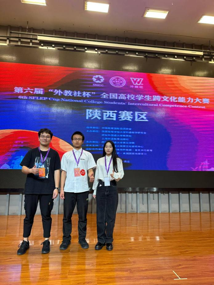 2023年第六屆“外教社杯”全國高校學生跨文化能力大賽陜西賽區(qū)復賽于10月15日在西安外國語大學長安校區(qū)舉行。在校級初賽中有出色表現(xiàn)的沈凌峰、馬竣中、黃沁妍三位同學代表我校參加了此次大賽。