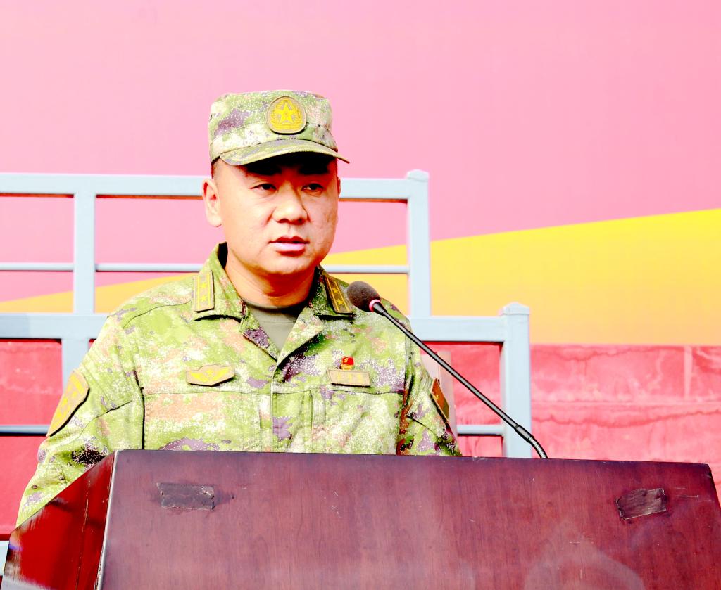 張海偉代表承訓(xùn)部隊(duì)致辭。他表示將按學(xué)校要求,嚴(yán)格執(zhí)行軍訓(xùn)任務(wù),圓滿完成既定目標(biāo),并希望全體參訓(xùn)學(xué)生敢于吃苦、嚴(yán)守紀(jì)律、牢記安全,提升國(guó)防意識(shí),鍛造堅(jiān)強(qiáng)意志,提高綜合素質(zhì)。