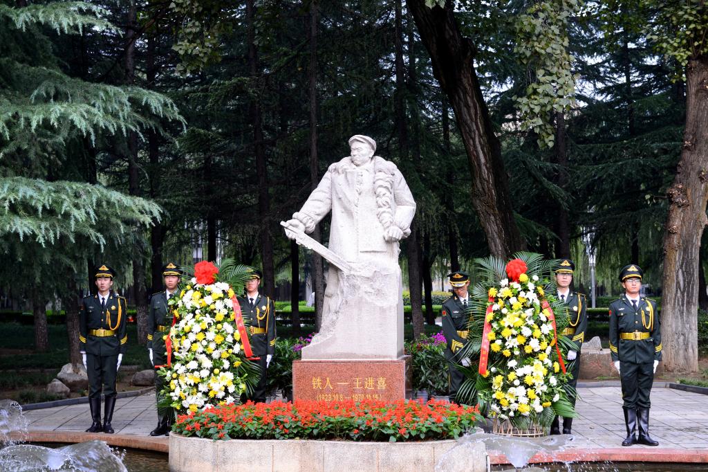 儀式上,國旗班向鐵人王進喜同志塑像敬獻花籃,標志著我校紀念鐵人王進喜誕辰100周年系列活動正式啟動。與會人員向鐵人王進喜塑像三鞠躬,并依次繞場瞻仰鐵人王進喜塑像,表達對鐵人王進喜的緬懷之情。