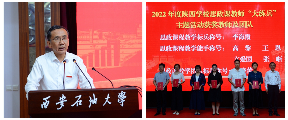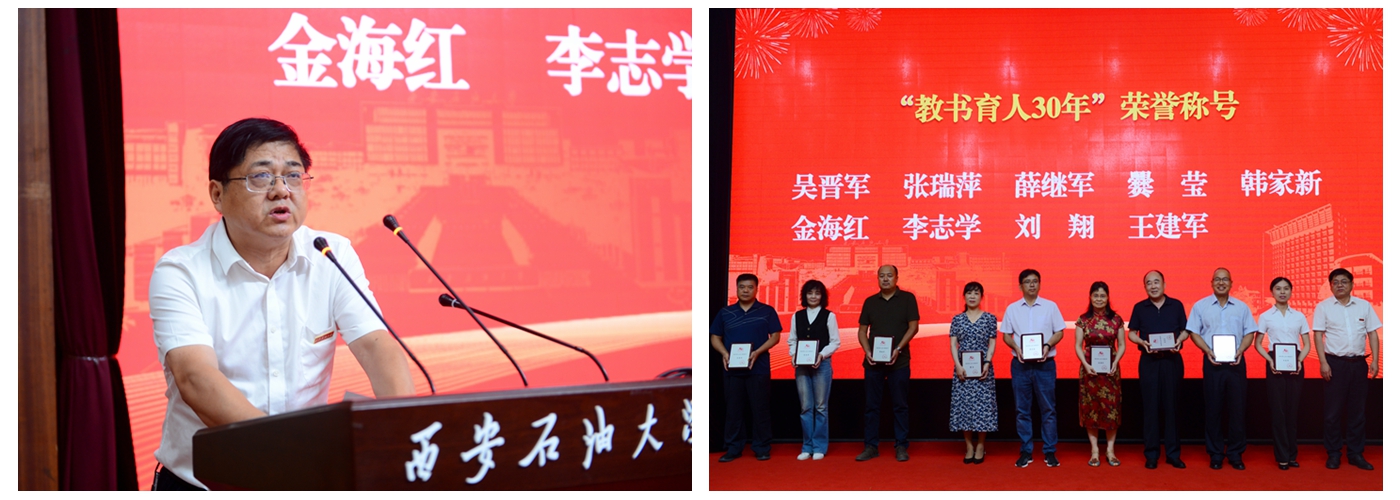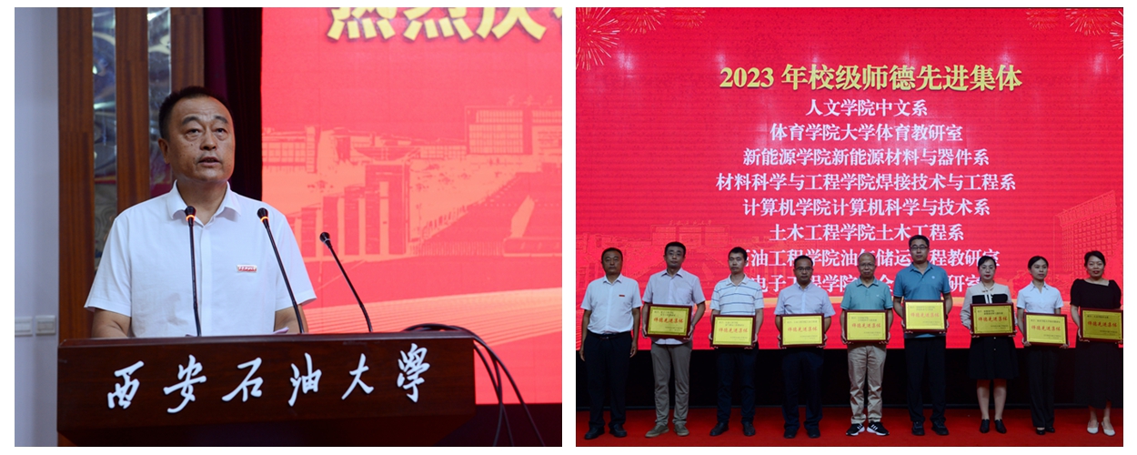 會上,校黨委書記賽云秀宣讀了《教育部關于公布第三批“全國高校黃大年式教師團隊”創(chuàng)建示范活動入圍名單的通知》《陜西省教育廳關于公布第二批陜西省高校黃大年式教師團隊的通知》,并為獲獎團隊頒獎;校長李天太宣讀了《教育部關于公布第二批國家級一流本科課程認定結(jié)果的通知》和2021-2022年度省科學技術獎獲獎項目名單,并為獲獎團隊和個人頒獎;校黨委副書記、紀委書記、監(jiān)察專員李延平宣讀了《陜西省教育廳關于表彰第十三屆陜西普通本科高等學校教學名師獎獲獎教師的通知》,并為獲獎教師頒獎;校黨委副書記張木宣讀了《中共陜西省委教育工委 陜西省教育廳關于對2022年陜西學校思政課教師“大練兵”主題活動中表現(xiàn)突出教師進行表揚的通知》,并為獲獎者頒獎;副校長楊戰(zhàn)社宣讀了《陜西省科學技術廳關于公布2022年度中青年科技創(chuàng)新領軍人才、科技創(chuàng)新創(chuàng)業(yè)人才及2023年度青年科技新星入選人員的通知》,并為入選者頒獎;副校長程永清宣讀了《中共西安石油大學委員會 西安石油大學關于表彰2023年師德建設先進集體和師德先進個人的決定》,并為獲獎教師頒獎;副校長張榮軍宣讀了《中共西安石油大學委員會 西安石油大學關于表彰2023年優(yōu)秀教師 先進教育工作者的決定》,并為獲獎教師代表頒獎;總會計師樊曉民宣讀了《西安石油大學關于表彰獎勵“教書育人30年”教師的決定》,并為獲獎教師頒獎。