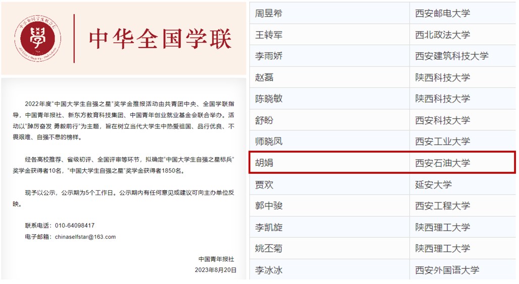 近日,由共青團中央、全國學(xué)聯(lián)指導(dǎo),中國青年報社、新東方教育科技集團、中國青年創(chuàng)業(yè)就業(yè)基金會聯(lián)合開展的2022年度“中國大學(xué)生自強之星”尋訪活動結(jié)果揭曉。我校石油工程學(xué)院研2021級胡娟榮獲“中國大學(xué)生自強之星”和“陜西省大學(xué)生自強之星標(biāo)兵”,石工(教改)2001班梁歡榮獲“陜西省大學(xué)生自強之星”。