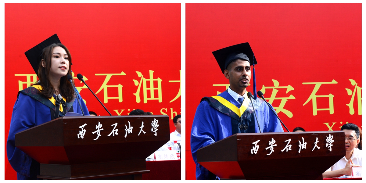 石油工程學(xué)院油氣田開發(fā)工程專業(yè)張洋同學(xué)和機械工程學(xué)院機械制造及其自動化專業(yè)留學(xué)生海桑同學(xué)分別代表畢業(yè)研究生發(fā)言,他們分享了研究生階段的成長經(jīng)歷和收獲,表達了對母校和老師的感恩之情以及立志奮發(fā)努力、勇敢前行的信心和勇氣。