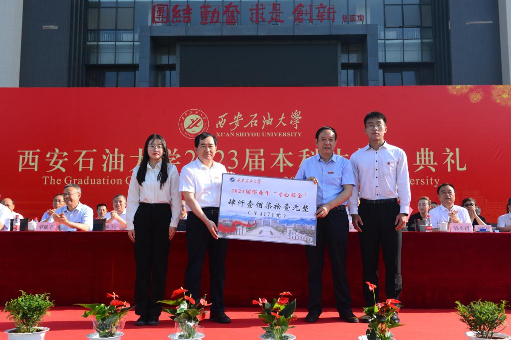 典禮上,校黨委書記賽云秀和校長李天太代表學(xué)校接受2023屆本科畢業(yè)生“寸心基金”捐款4171元。