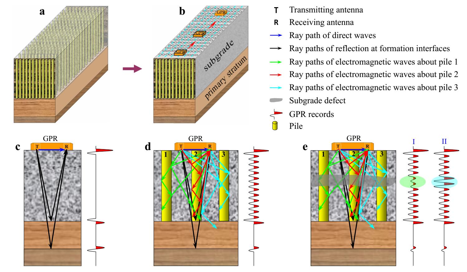 圖1 群樁加固軟土地基的地質(zhì)模型及其GPR響應(yīng)特征