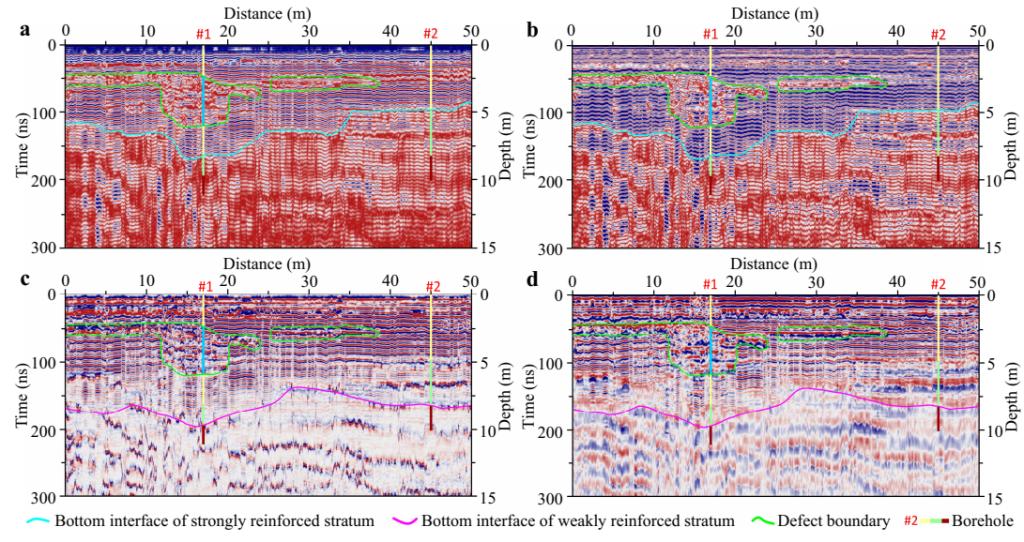 針對上述困難和挑戰(zhàn),研究團(tuán)隊(duì)歷時數(shù)年研究,通過理論推導(dǎo)、模型構(gòu)建、數(shù)值模擬、軟件開發(fā)和現(xiàn)場試驗(yàn)等手段,創(chuàng)新提出了將樁基缺陷檢測轉(zhuǎn)化為地基加固質(zhì)量評價的思想,構(gòu)建出樁群加固地基的地質(zhì)模型,揭示了群樁條件下地基的地質(zhì)雷達(dá)(Ground Penetrating Radar,GPR)響應(yīng)特征,研發(fā)出GPR多屬性信息提取軟件新技術(shù),并建立了樁基缺陷檢測及地基加固質(zhì)量評價的GPR技術(shù)體系。依托甘肅省安臨高速公路建設(shè)項(xiàng)目,研究團(tuán)隊(duì)開展了GPR技術(shù)在DCM樁缺陷檢測及地基加固質(zhì)量評價中的應(yīng)用實(shí)踐。研究結(jié)果表明,通過融合單道波形、多道剖面、GPR屬性和鉆孔等信息,可準(zhǔn)確識別出樁長和強(qiáng)/弱加固層、原生地層、缺陷地層的埋深及范圍等。該研究成果為軟土地基的DCM樁加固質(zhì)量評價提供了一種快速、高效和經(jīng)濟(jì)的技術(shù)解決方案,填補(bǔ)了樁群數(shù)量大、樁距小、密度高等情況下樁基缺陷高效檢測的技術(shù)空白。