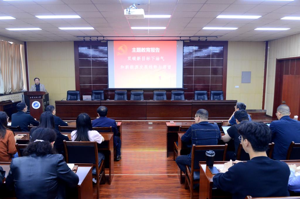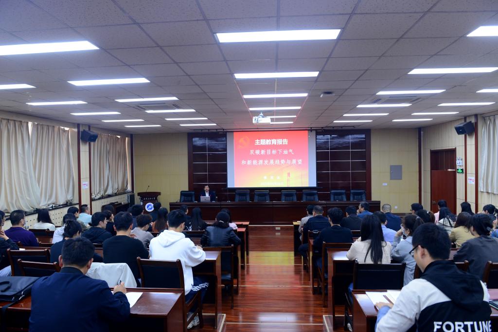 李天太在講授中強調了本次學習貫徹習近平新時代中國特色社會主義思想主題教育的總要求、根本任務、5個目標、著力解決6個方面突出問題,并從雙碳新目標、世界油氣發(fā)展趨勢、我國油氣發(fā)展趨勢、石油天然氣勘探開發(fā)關鍵技術和新能源發(fā)展展望五個方面出發(fā),指出當前我國正處于實現(xiàn)“雙碳”目標、構建“清潔低碳、安全高效”能源體系的關鍵時期,做好“碳達峰、碳中和”工作要加快調整優(yōu)化產業(yè)結構、能源結構。我校作為以石油石化為特色的多科性普通高等學校,要深刻把握新能源技術發(fā)展水平與趨勢,始終推進學校向高水平教學研究型大學邁進,持續(xù)強化和拓展學校優(yōu)勢學科領域、落實“雙一流”建設,堅持立德樹人根本任務,堅持科技創(chuàng)新“四個面向”,著力培養(yǎng)“三和”+“三碳”人才,服務于國家能源建設。