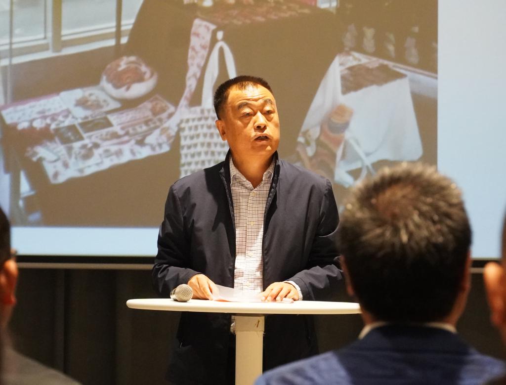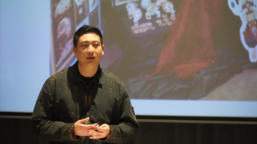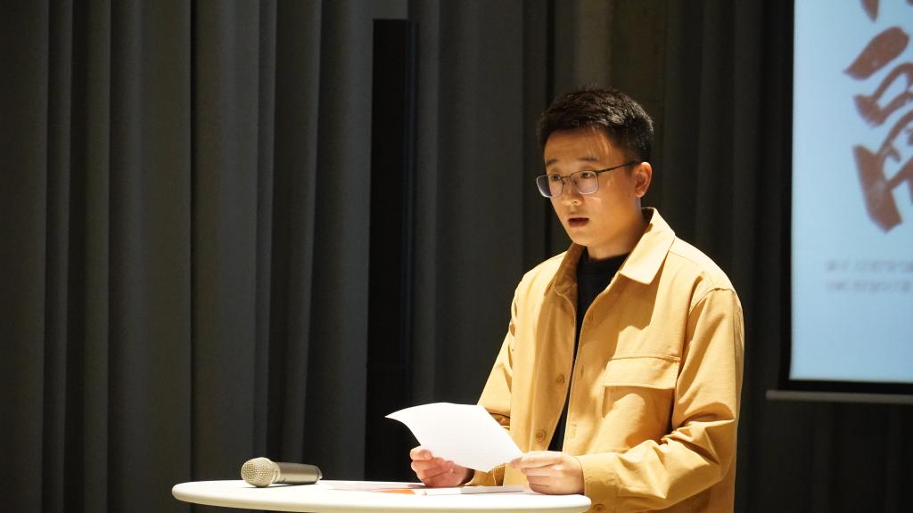 人文學院2023屆藝術(shù)碩士研究生畢中澤作為學生代表發(fā)言。他首先代表17位即將畢業(yè)的研究生感謝學校領(lǐng)導和相關(guān)職能部門提供的展示平臺,本次展覽是同學們在深入學習中國傳統(tǒng)文化、關(guān)注現(xiàn)實生活、探尋藝術(shù)規(guī)律的基礎(chǔ)上,將藝術(shù)與技術(shù)融合思考轉(zhuǎn)化為設(shè)計實踐的一次綜合嘗試,反映出同學們時刻關(guān)注社會、服務(wù)社會的創(chuàng)作初心。