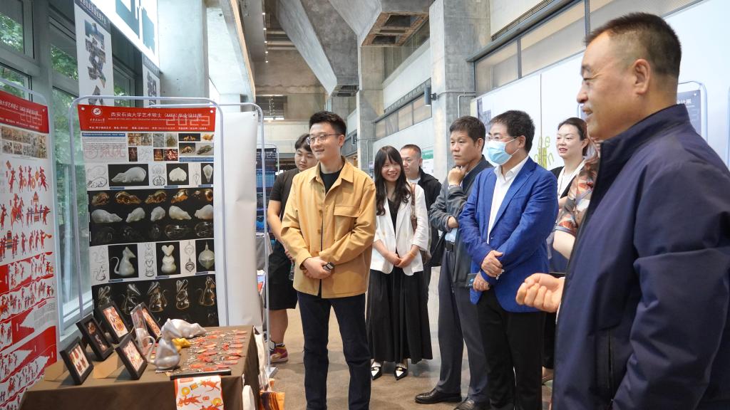 開幕式結(jié)束后,同學們在各自展位前向與會領(lǐng)導嘉賓詳細介紹了自己的創(chuàng)作理念和研究方法,從技藝融合的角度綜合性開展老舊礦業(yè)社區(qū)人居環(huán)境更新設(shè)計、工業(yè)遺產(chǎn)歷史風貌區(qū)街坊改造設(shè)計、非物質(zhì)文化遺產(chǎn)保護與傳承研究、民俗民藝拓展應(yīng)用等實踐創(chuàng)新設(shè)計,得到了與會嘉賓的贊揚和好評。