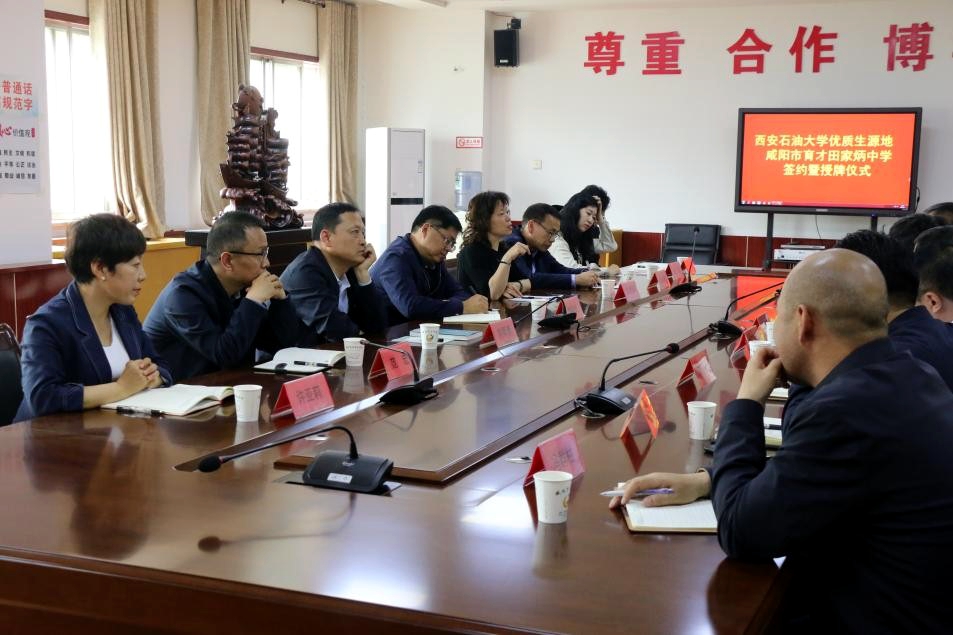 會(huì)上,雙方簽訂了“西安石油大學(xué)優(yōu)秀生源基地”協(xié)議書,王君萍代表學(xué)校向咸陽市育才田家炳中學(xué)授牌。