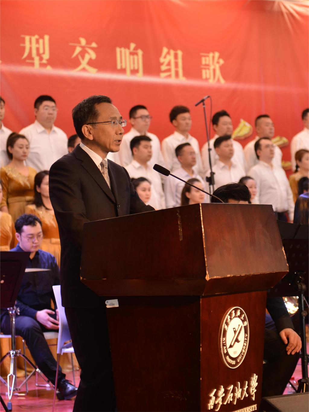 張木在演出前致辭。他首先對(duì)陜西省歌舞劇院各位演出人員的到來(lái)表示熱烈歡迎和衷心感謝,隨后講到《偉大的征程》這部大型交響組歌是對(duì)中國(guó)共產(chǎn)黨主要?dú)v史事件的回顧,是對(duì)豐功偉業(yè)的歌頌,是對(duì)美好未來(lái)的展望,此次交響樂(lè)會(huì)是西安石油大學(xué)“音樂(lè)廳里的思政課”,藝術(shù)家們將以精彩的表演引導(dǎo)青年學(xué)子樹(shù)立正確審美觀,陶冶高尚的審美情操。
