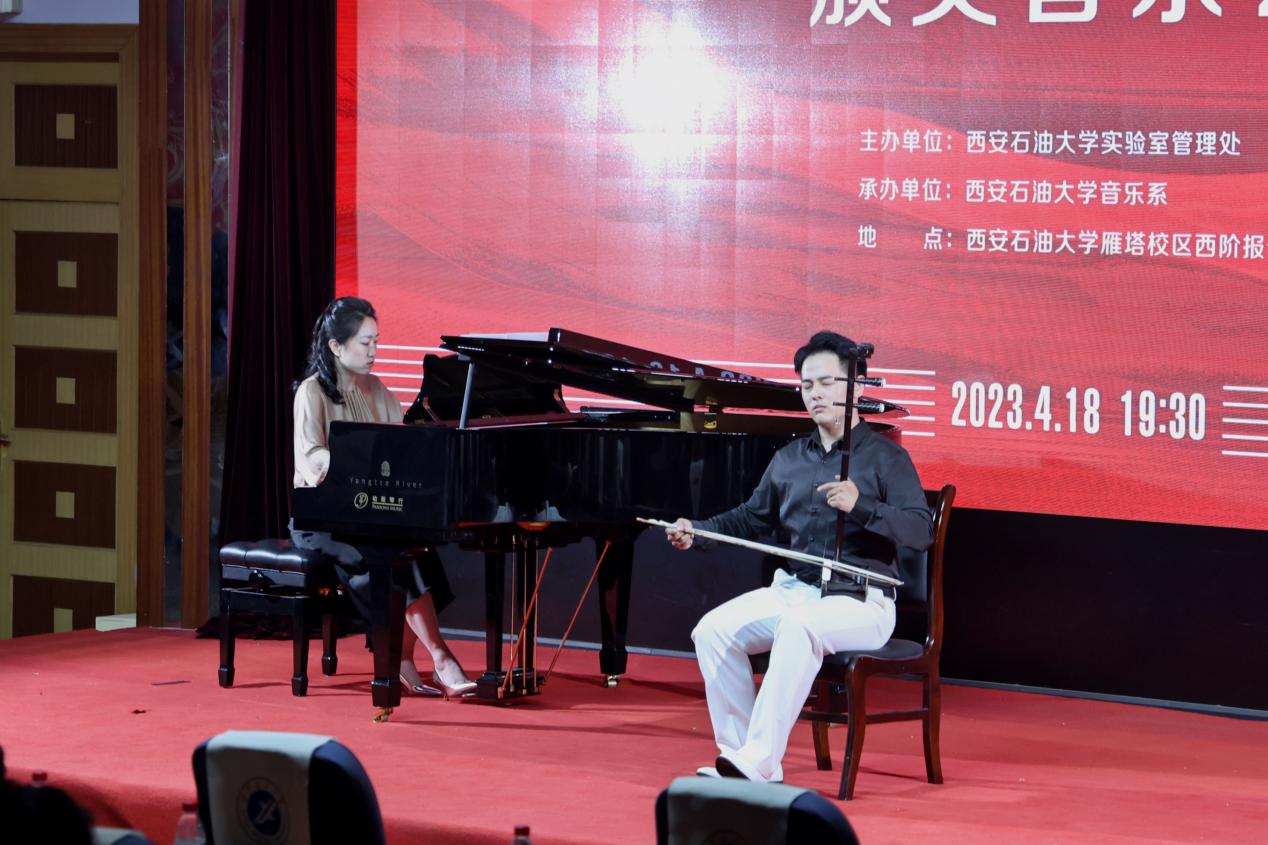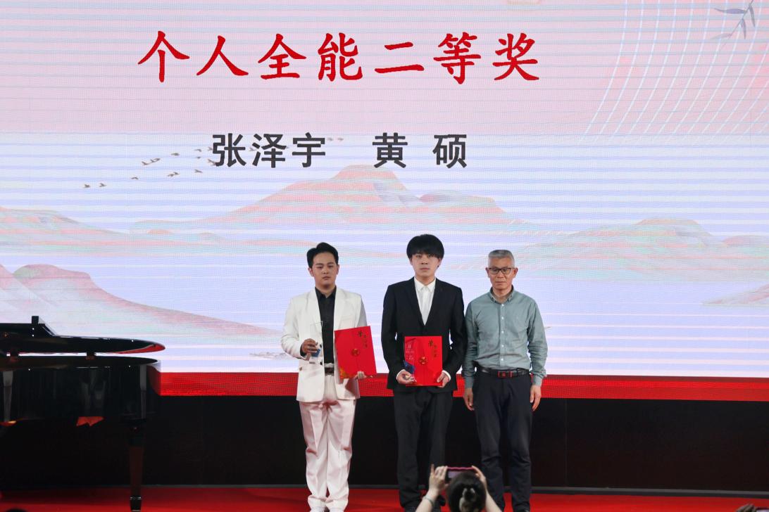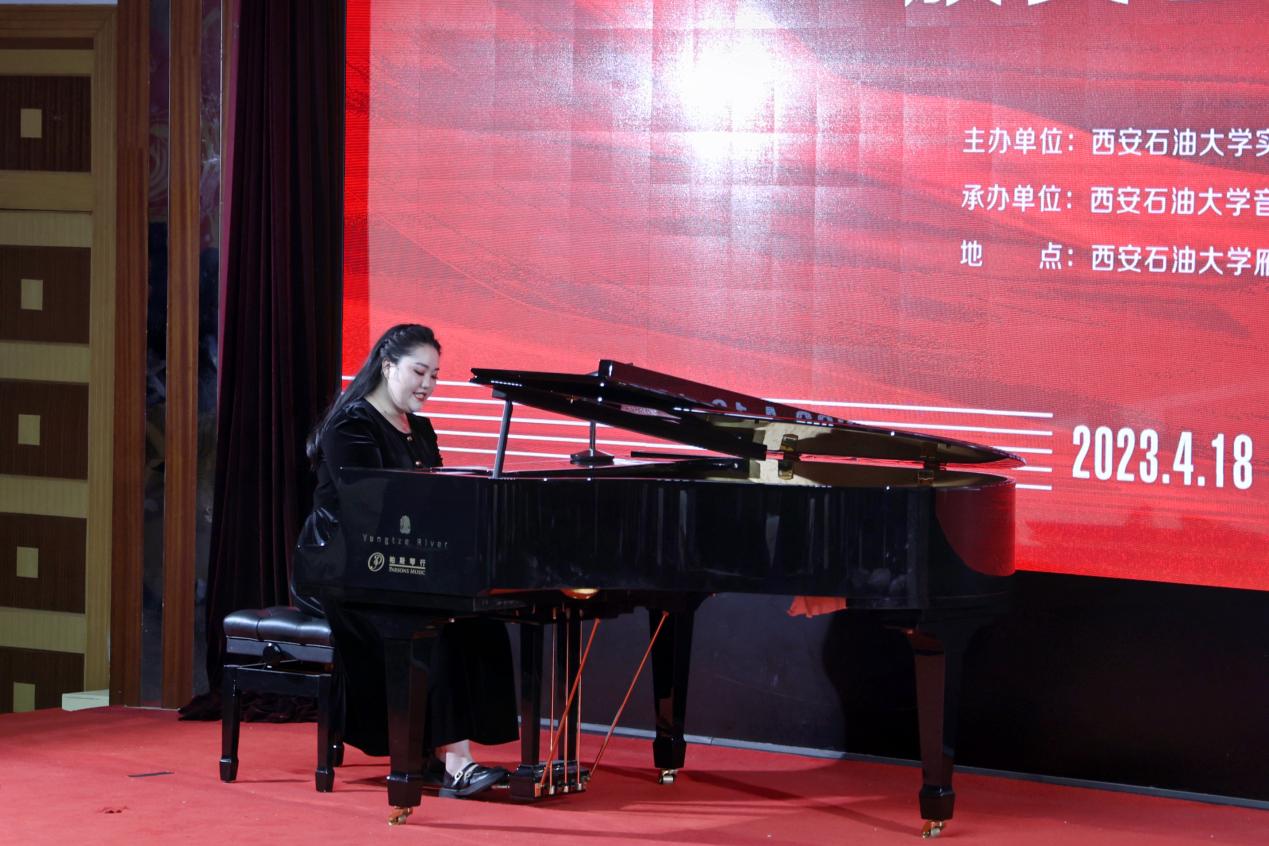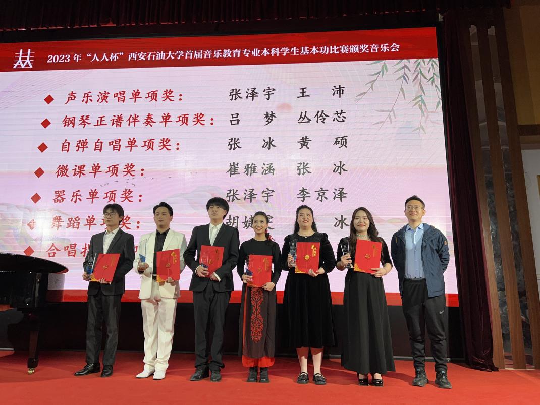 頒獎晚會由本次獲獎的部分學(xué)生和評委教師代表共同呈現(xiàn)了一場別開生面的演出。舞蹈單項獎獲得者胡婕雯同學(xué)帶來的舞蹈《九兒》拉開了展演序幕。鋼琴正譜伴奏單項獎獲得者呂夢同學(xué)和演唱嘉賓樊長春同學(xué)共同演繹了經(jīng)典聲樂作品《秋水長天》,自彈自唱單項獎獲得者張冰同學(xué)帶來《同一首歌》,展現(xiàn)了較強的鋼琴演奏及聲樂演唱能力。器樂單項獎獲得者張澤宇同學(xué)一曲二胡《秦腔主題隨想曲》激起觀眾內(nèi)心的波瀾。系特聘專家陜西師范大學(xué)音樂學(xué)院雷倩副教授和西安人人藝術(shù)學(xué)校彭忠波校長分別為大家演唱《圪梁梁》和《我是一條小河》,我校音樂系副教授寇利利演唱經(jīng)典民族歌劇選段《生死與黨心相連》,三位老師的精彩演唱展現(xiàn)了扎實的專業(yè)基本功,贏得了現(xiàn)場陣陣掌聲與歡呼。演出的最后,全場師生齊唱《我的祖國》,表達(dá)了內(nèi)心的民族自豪感和愛國熱情,把整場晚會的氣氛推向了高潮。