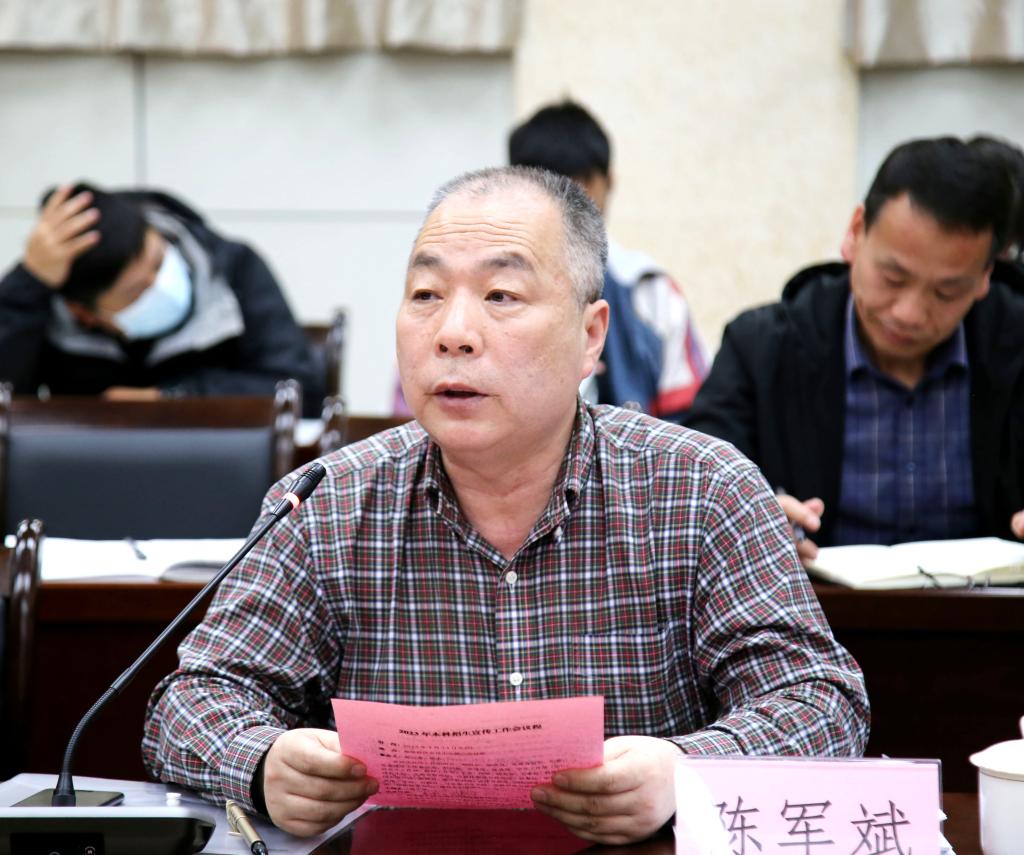 陳軍斌分析了學(xué)校的學(xué)科優(yōu)勢和專業(yè)特色,強(qiáng)調(diào)了招生面臨的機(jī)遇與挑戰(zhàn),就當(dāng)前招生宣傳工作提出四點(diǎn)要求:一是要強(qiáng)化招生宣傳隊(duì)伍建設(shè),選拔政治素質(zhì)高、責(zé)任心強(qiáng)、學(xué)術(shù)水平高、有奉獻(xiàn)精神的教師進(jìn)入招生宣傳組,充分發(fā)揮專家教授專業(yè)優(yōu)勢,提升招生宣傳質(zhì)量和咨詢服務(wù)能力;二是要加強(qiáng)專業(yè)內(nèi)涵建設(shè),充分發(fā)揮招生-培養(yǎng)-就業(yè)聯(lián)動(dòng)機(jī)制作用,完善專業(yè)動(dòng)態(tài)調(diào)整機(jī)制,以國家戰(zhàn)略和市場需求為導(dǎo)向,優(yōu)化專業(yè)布局,深化“四新”建設(shè),加速傳統(tǒng)學(xué)科專業(yè)升級(jí)改造,培養(yǎng)適應(yīng)經(jīng)濟(jì)社會(huì)發(fā)展需要的高素質(zhì)專門人才;三是要推進(jìn)生源基地建設(shè)與維護(hù),積極走訪生源中學(xué),了解中學(xué)需求,開展專業(yè)科普講座、生涯規(guī)劃指導(dǎo),邀請中學(xué)師生代表來訪研學(xué),通過“走出去”“引進(jìn)來”方式,增進(jìn)互動(dòng)交流,擴(kuò)大學(xué)校社會(huì)影響力;四是要拓寬招生宣傳渠道,創(chuàng)新招生宣傳方式,發(fā)揮新媒體優(yōu)勢,打造全媒體宣傳矩陣,借助社會(huì)主流媒體,強(qiáng)化宣傳力度,線上線下共同發(fā)力、密切配合,強(qiáng)化宣傳材料的傳播效果,提供全面周到的咨詢服務(wù)。