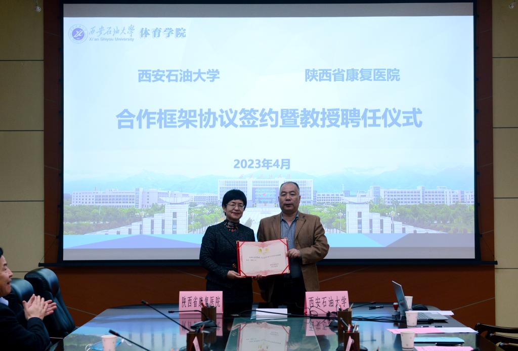 會(huì)上,陳軍斌代表學(xué)校向陜西省康復(fù)醫(yī)院研究生聯(lián)合培養(yǎng)基地授牌,并向石秀娥頒發(fā)特聘教授聘書。