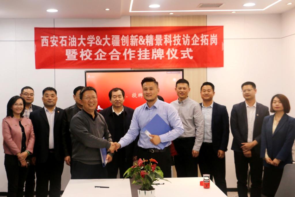 在與會人員共同見證下,舉行了精景科技公司和西安石油大學聯(lián)合培養(yǎng)暨校外實習基地簽約儀式及校企合作掛牌儀式。李天太為企業(yè)掛牌,張愈和譚成仟代表雙方簽約。
