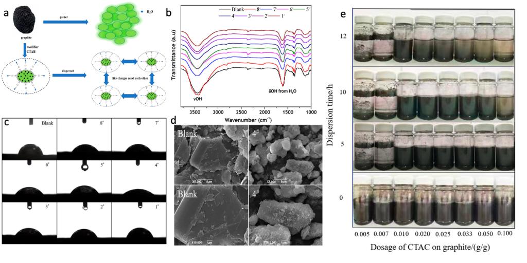 水基膨潤土鉆井液中的粘土在高溫下易發(fā)生聚結(jié)、表面鈍化等作用,超高溫還會導致處理劑降解或者分解,削弱甚至消除處理劑在粘土表面的吸附作用,致使鉆井液抗溫性差,因此,超高溫鉆井液技術(shù)是實現(xiàn)深層超深層鉆井的關(guān)鍵技術(shù)之一。該課題組針對高溫鉆井液的技術(shù)需求開展研究工作。采用表面活性劑改性石墨制備高度分散的滑潤劑,如圖1所示。由于石墨表面改性后出現(xiàn)擴散雙電層,使得石墨在水中和水基鉆井液中表現(xiàn)出強分散性。在180℃下,添加改性石墨可降低泥餅粘滯系數(shù)67%(Materials2022,15,1083. https://doi.org/10.3390/ma15031083)