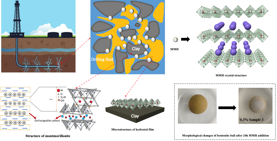 該課題組同時對抗高溫環(huán)保型鉆井液抑制劑進行了研究,在現(xiàn)有鎂鋁插層聚合物(MMH)的基礎(chǔ)上,優(yōu)化制備條件,如圖2所示。當鎂鋁比為3時插層聚合物表現(xiàn)出優(yōu)異的性能,在鉆井液中添加量為0.3%時鉆井液的抑制性能參數(shù)較添加4%KCl的鉆井液提高了136.2%。經(jīng)過200℃老化16h后,添加了鎂鋁插層聚合物的鉆井液仍表現(xiàn)出良好的抑制性和提切性。(Minerals2022, 12(4), 459.論文鏈接:https://doi.org/10.3390/min12040459)