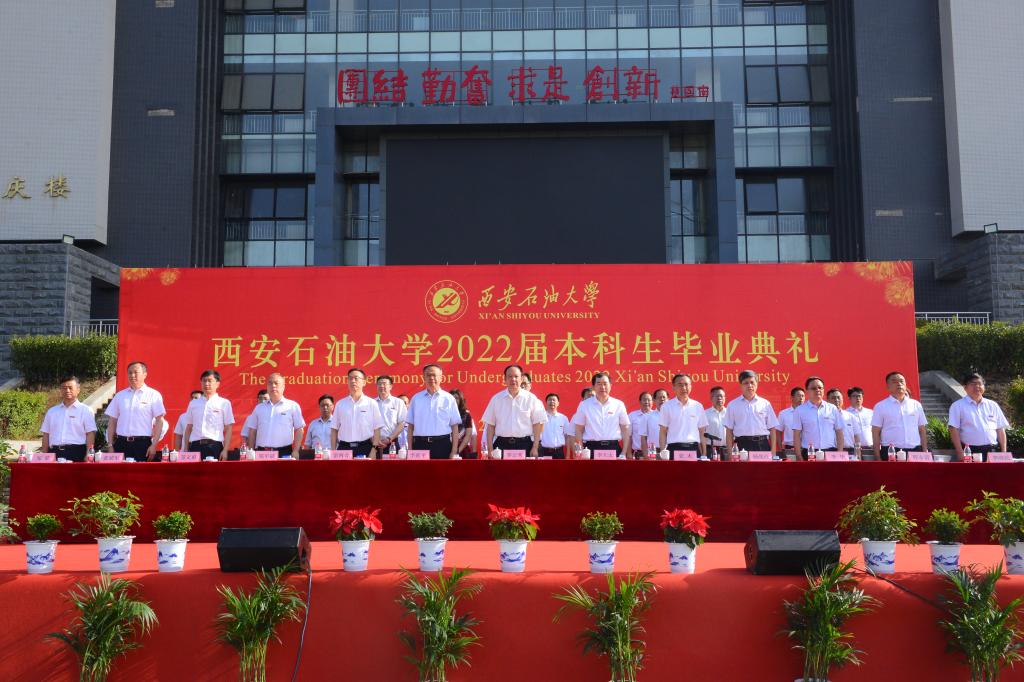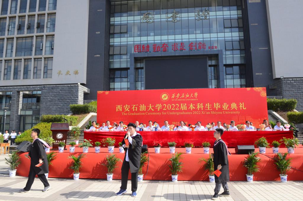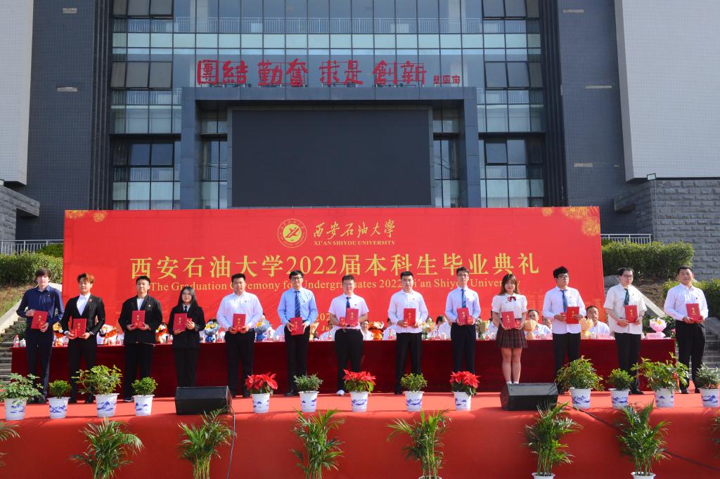 副校長陳軍斌宣讀了《西安石油大學關于2022屆本科學生準予畢業(yè)、頒發(fā)畢業(yè)證和授予學士學位的決定》,副校長楊戰(zhàn)社宣讀了《西安石油大學關于表彰2022屆優(yōu)秀畢業(yè)生的決定》,校黨委副書記雷西合宣讀了《西安石油大學校友總會關于聘任2022屆年級校友理事的決定》。與會校領導為志愿服務西部計劃、榮獲優(yōu)秀畢業(yè)生榮譽稱號的學生代表頒發(fā)了榮譽證書并贈送了“原油”印章紀念品,為年級理事代表頒發(fā)了聘任證書和紀念品。