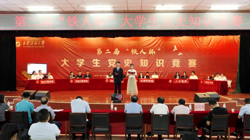 6月13日晚,由馬克思主義學(xué)院、教務(wù)處主辦,組織部、宣傳部、學(xué)工部、校團(tuán)委協(xié)辦的第二屆“鐵人杯”大學(xué)生黨史知識(shí)競(jìng)賽決賽在鄠邑校區(qū)騰輝大學(xué)生活動(dòng)中心隆重舉行。校黨委副書記張木出席,相關(guān)部門負(fù)責(zé)人、教師及學(xué)生代表參加本次活動(dòng)。經(jīng)過兩場(chǎng)初賽,電子工程學(xué)院、石油工程學(xué)院、地球科學(xué)與工程學(xué)院、計(jì)算機(jī)學(xué)院、人文學(xué)院、外國(guó)語(yǔ)學(xué)院六支代表隊(duì)進(jìn)入決賽。