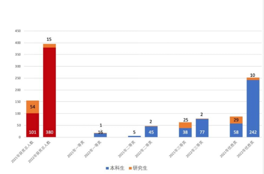 2021年,外國語學院成立指導教師團隊,首次組織我校學生參與此項賽事,積累了一定的經(jīng)驗。2022年,團隊教師齊心協(xié)力,負責競賽宣傳動員、報名信息收集整理、校內模擬和參賽選手賽前分組訓練指導工作;參賽學生積極、認真?zhèn)滟悺T趲熒墓餐ο?,我校學生在本屆全國學術英語詞匯競賽中成績斐然,在獲獎等級和獲獎比率方面均取得了可喜突破。獲獎總人數(shù)為395人,獲獎率從2021年的約10.5%提高到2022年的約34%。