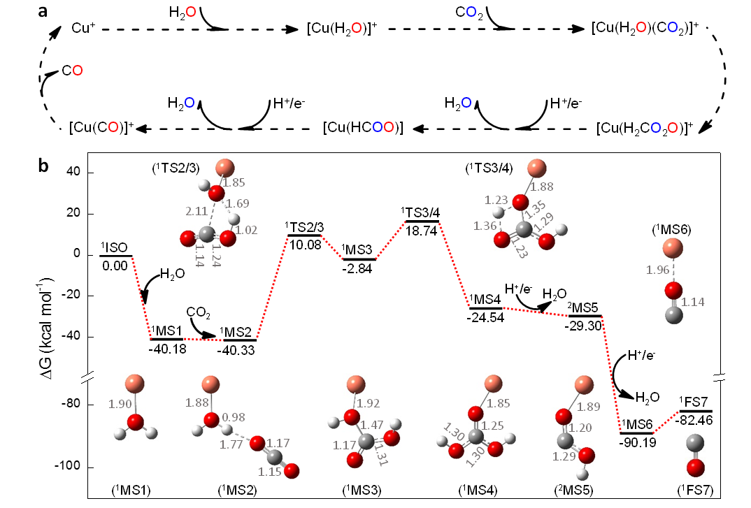 按照傳統(tǒng)觀點(diǎn),二氧化碳還原轉(zhuǎn)化為一氧化碳中的O原子來(lái)自二氧化碳。該研究中,科研人員發(fā)現(xiàn)還原反應(yīng)生成一氧化碳中的O原子來(lái)自反應(yīng)體系催化劑表面的配位水分子,而非二氧化碳本身。該結(jié)論不僅適用于質(zhì)在線反應(yīng)過程,也適用于實(shí)際二氧化碳的電催化還原反應(yīng)和工業(yè)化水煤氣逆反應(yīng)過程,說(shuō)明該發(fā)現(xiàn)具有一定的普適性。同時(shí)發(fā)現(xiàn)相比于金屬催化劑Cu+,當(dāng)[Cu(H2O)]+作為催化劑時(shí),二氧化碳還原為一氧化碳的反應(yīng)效率可提高兩個(gè)數(shù)量級(jí)。為了深入探究該反應(yīng)過程,科研人員通過改造質(zhì)譜儀對(duì)反應(yīng)中間體的捕獲、同位素對(duì)比實(shí)驗(yàn)和密度泛函理論的計(jì)算,詳細(xì)闡述了二氧化碳在[Cu(H2O)]+催化作用下生成一氧化碳的機(jī)制。該工作不僅為深入闡述二氧化碳還原機(jī)理提供了方法學(xué)基礎(chǔ),也為詳細(xì)了解水在二氧化碳還原過程中的作用提供了著眼點(diǎn)。