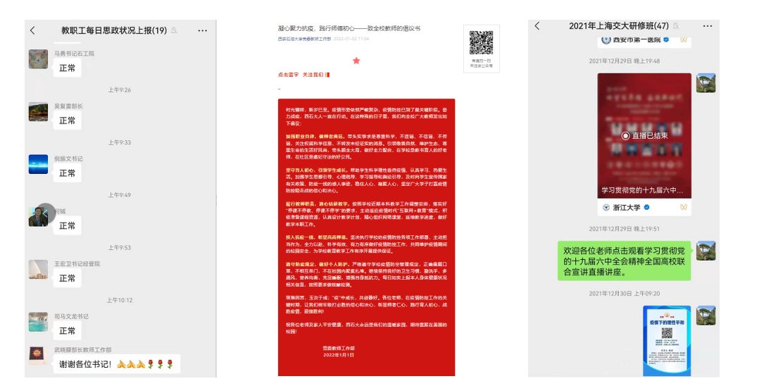 思想政治教育全覆蓋,強化教職工思想引領。建立學校教職工思想政治狀況信息群,各院(系)級單位黨組織書記在群內每天上報本單位教職工思想政治狀況,精準排查不漏一人,加強觀測引導,對全校教職工思想政治狀況切實做到底子清、情況明、措施實。發(fā)出《致全校教師的倡議書》,組織教師線上觀看學習貫徹黨的十九屆六中全會精神全國高校聯(lián)合宣講直播講座,在部門所屬各教師群內轉發(fā)疫情防控法律法規(guī),教育教師在學校做好老師,在社區(qū)做好公民。