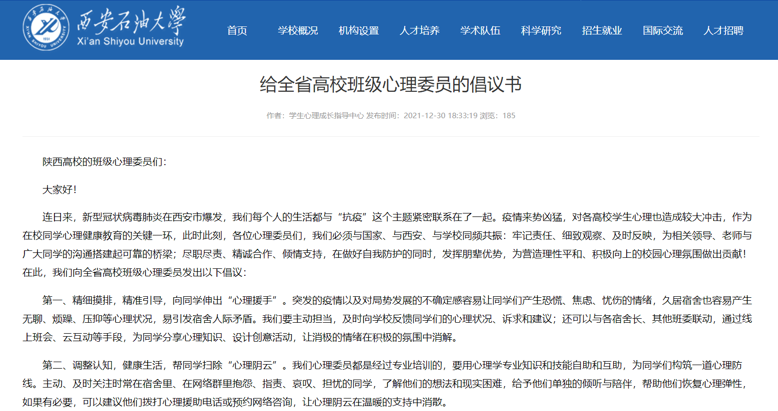 1216日學(xué)校黨委安排部署疫情防控工作以來(lái),黨委學(xué)生工作部、研究生工作部密切聯(lián)動(dòng),各院(系)黨委(總支)積極配合,迅速啟動(dòng)學(xué)生工作干部24小時(shí)在崗、鄠邑校區(qū)每周輪值等工作制度,確保一線工作力量充足,全方位有序做好思想教育引導(dǎo)、政策法律宣傳、衛(wèi)生防疫知識(shí)學(xué)習(xí)等工作。