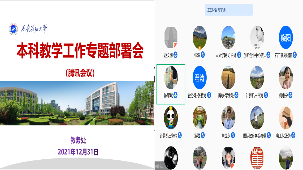 為深入貫徹全省教育系統(tǒng)疫情防控工作視頻會(huì)議精神,落實(shí)學(xué)校疫情防控決策部署和工作要求,全力以赴做好疫情防控期間本科教學(xué)工作,保障本科在線教學(xué)平穩(wěn)有序運(yùn)行,20211231日下午,學(xué)校疫情防控教學(xué)工作組召開(kāi)了線上本科在線教學(xué)工作專題部署會(huì)。副校長(zhǎng)陳軍斌出席會(huì)議,學(xué)生工作部(處)、教務(wù)處、實(shí)驗(yàn)室管理處、創(chuàng)新創(chuàng)業(yè)中心、高教研究與評(píng)估中心負(fù)責(zé)人以及各院(系)主管教學(xué)院長(zhǎng)(主任)、教學(xué)辦公室主任參加會(huì)議。教務(wù)處處長(zhǎng)張君濤主持會(huì)議。