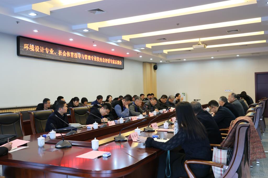環(huán)境設計專業(yè)負責人方松林、社會體育指導與管理專業(yè)負責人李壽邦匯報了專業(yè)自評自建情況。匯報結束后,專家組針對專業(yè)認證自評報告內(nèi)容進行了質(zhì)詢。