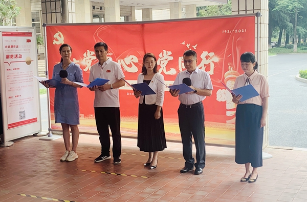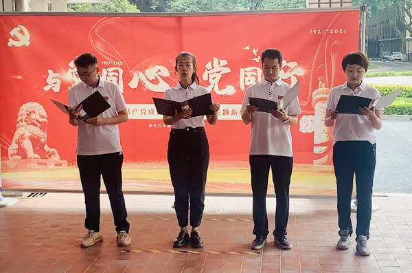由蔣華義、孟開元、朱瑋、張帆和唐媛芬五位黨員朗誦的詩歌《可愛的中國》,拉開了詩歌朗誦和紅歌獻唱環(huán)節(jié)的序幕。接著參演人員依次登臺,朗誦了詩歌《紅船》和《永在》,演唱了紅歌《唱支山歌給黨聽》和《奮進新時代》。飽含深情的朗誦和演唱,帶領大家一起回憶了中國共產(chǎn)黨走過的崢嶸歲月,贊美了中國共產(chǎn)黨帶領中國人民取得的豐碩成果,抒發(fā)了在場黨員對黨對祖國的無限熱愛。