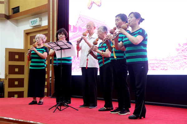 之后,老年大學(xué)的學(xué)員們和離退休教職工為大家?guī)?lái)了精彩的文藝節(jié)目。演出在開(kāi)場(chǎng)舞《唱支山歌給黨聽(tīng)》中拉開(kāi)了帷幕。老年大學(xué)女子合唱隊(duì)帶來(lái)的女聲小合唱《沒(méi)有共產(chǎn)黨就沒(méi)有新中國(guó)》《中國(guó)一定強(qiáng)》,合唱團(tuán)男生小合唱《把一切獻(xiàn)給黨》,合唱團(tuán)女生小合唱《洪湖浪花》《天使的聲音》,葫蘆絲樂(lè)團(tuán)的聯(lián)奏《紅歌聯(lián)奏》等節(jié)目,充分展示了老年大學(xué)的教學(xué)成果和老同志熱愛(ài)黨、熱愛(ài)生活的良好精神面貌。黃放明老師京劇清唱《朝霞映在陽(yáng)澄湖上》,老年大學(xué)瑜伽協(xié)會(huì)帶來(lái)的瑜伽表演《人間第一情》、馮原、漢澤西等老同志帶來(lái)的詩(shī)詞朗誦《人民萬(wàn)歲》《西石大賦》,展示了離退休教職工的多才多藝。文藝演出最后,我校原校長(zhǎng)張寧生教授領(lǐng)唱,老年大學(xué)合唱團(tuán)60多名團(tuán)員共同演唱的《不忘初心》《我家在中國(guó)》,將老同志、老黨員對(duì)偉大祖國(guó)的熱愛(ài)匯集成流淌的歌聲,祝福偉大的祖國(guó)繁榮昌盛,祝福偉大的黨永遠(yuǎn)不忘初心,將現(xiàn)場(chǎng)氣氛引向高潮。