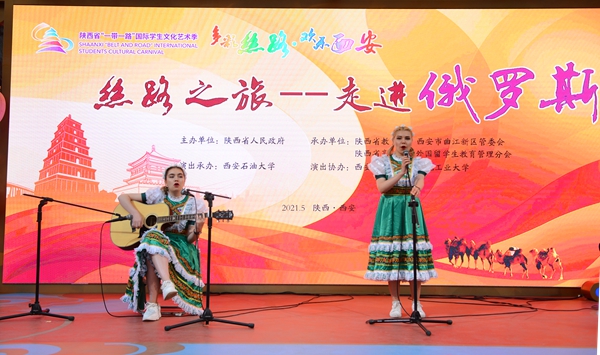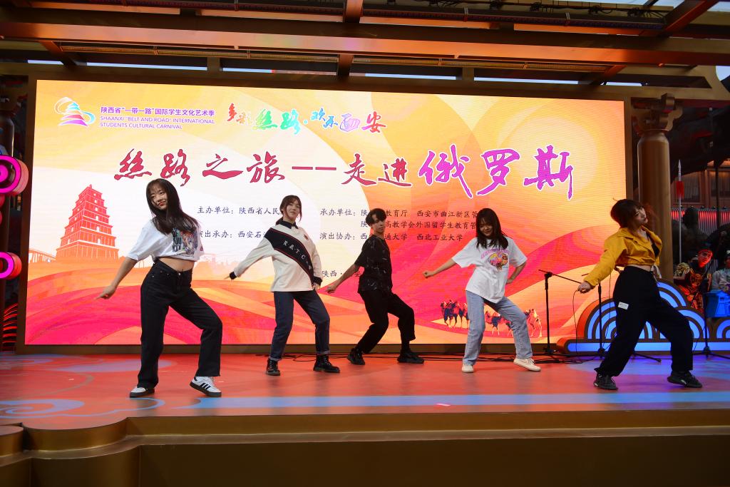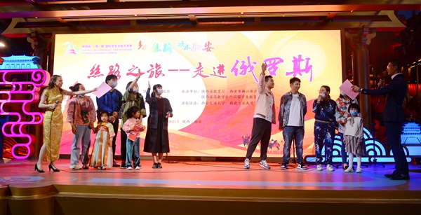 首場演出展示活動(dòng)將俄羅斯作為主題國,由我校牽頭承辦,西安交通大學(xué)、西北工業(yè)大學(xué)協(xié)辦,通過中外學(xué)生服裝走秀、歌曲聯(lián)唱、舞蹈表演、樂器彈奏及現(xiàn)場互動(dòng)等形式,在大唐不夜城步行街展演展示俄羅斯與中國優(yōu)秀傳統(tǒng)文化。我校副校長張榮軍、陜西省教育廳外事處處長文通,以及現(xiàn)場眾多游客觀看演出并參與互動(dòng)。