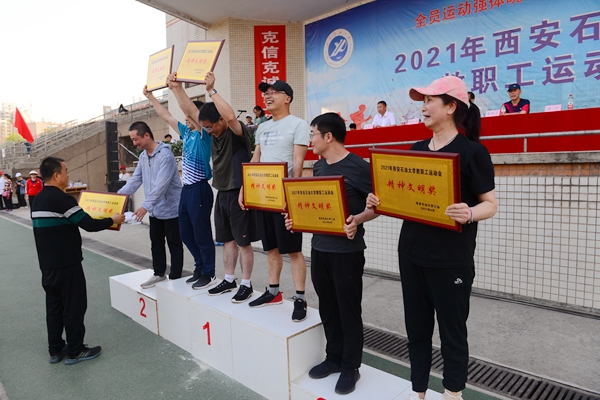 雷西合副書記為榮獲本屆運(yùn)動(dòng)會(huì)團(tuán)體總分前六名的代表隊(duì)頒獎(jiǎng),分別是:機(jī)關(guān)七代表隊(duì)與體育系代表隊(duì)(并列)、石油工程學(xué)院代表隊(duì)、經(jīng)濟(jì)管理學(xué)院代表隊(duì)、人文學(xué)院代表隊(duì)、地球科學(xué)與工程學(xué)院代表隊(duì)、機(jī)關(guān)二代表隊(duì)。