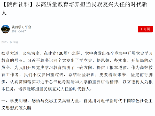 4月27日,“學(xué)習(xí)強(qiáng)國(guó)”陜西學(xué)習(xí)平臺(tái)刊發(fā)我校程永清副校長(zhǎng)《以高質(zhì)量教育培養(yǎng)擔(dān)當(dāng)民族復(fù)興大任的時(shí)代新人》的文章,文章以學(xué)史明理,感悟馬克思主義真理力量,自覺用習(xí)近平新時(shí)代中國(guó)特色社會(huì)主義思想武裝頭腦;學(xué)史增信,堅(jiān)定共產(chǎn)主義信仰,發(fā)揮中國(guó)特色社會(huì)主義制度優(yōu)勢(shì),始終做到“兩個(gè)維護(hù)”;學(xué)史崇德,堅(jiān)持教書育人,傳播和弘揚(yáng)社會(huì)主義核心價(jià)值觀;學(xué)史力行,深化人才培養(yǎng)模式改革,推動(dòng)高等教育高質(zhì)量發(fā)展等四個(gè)方面進(jìn)行闡述。