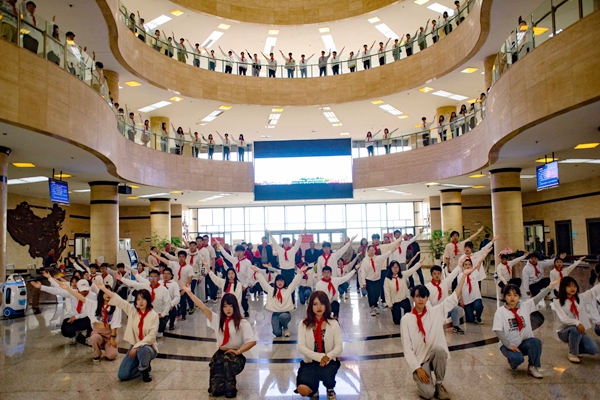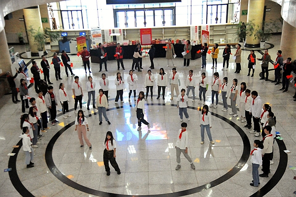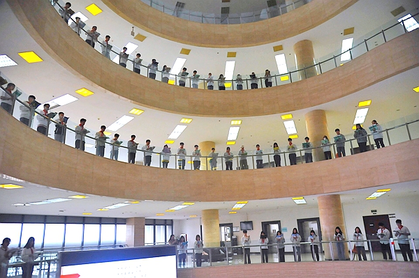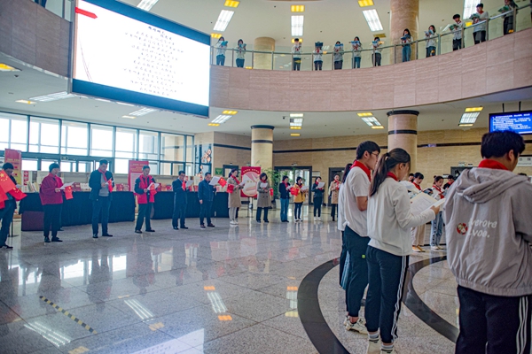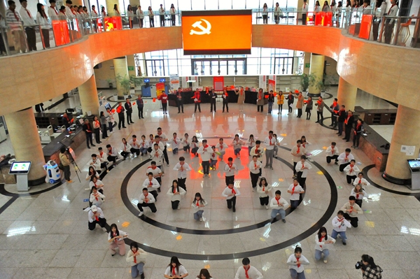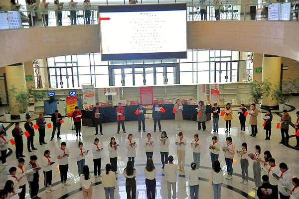 421日上午,在鄠邑校區(qū)墨香濃郁、書香四溢的圖書館大廳,以“銘記光輝歷史,創(chuàng)造美好未來”為主題的圖書館2021年校園文化活動在師生共同參與的快閃活動中拉開了帷幕。李華副校長,各職能部門負(fù)責(zé)人、各院系副書記,100余名同學(xué)們一起參加了啟動儀式。