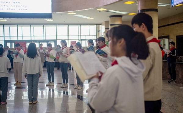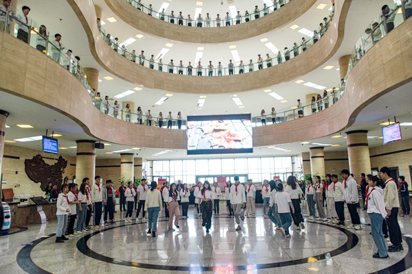 200名師生戴著紅領(lǐng)巾一起朗誦了《為學(xué)之道》、《沁園春·長沙》、《你是人間四月天》和《輝煌明天》四首詩歌?!稙閷W(xué)之道》強調(diào)了博學(xué)、審問、慎思、明辨和篤行,同學(xué)們明白了學(xué)習(xí)重在方法,貴在堅持。《沁園春·長沙》抒發(fā)了革命青年對國家命運的感慨,蔑視反動統(tǒng)治者、改造舊中國的豪情壯志,同學(xué)們感受到以天下為己任的家國情懷。《你是人間四月天》以景喻情,激發(fā)了同學(xué)們對生活的期待?!遁x煌明天》表達(dá)了學(xué)校支持國家發(fā)展、培育青年學(xué)子獻(xiàn)身石油的情懷和學(xué)校未來發(fā)展的美好愿望。