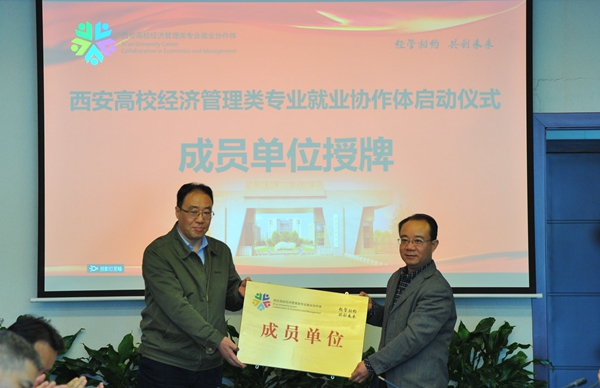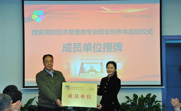 陜西省教育廳高校學(xué)生工作處二級(jí)調(diào)研員胡偉安依次為西安高校經(jīng)濟(jì)管理類(lèi)專業(yè)就業(yè)協(xié)作體成員單位西安石油大學(xué)、西北政法大學(xué)、西安外國(guó)語(yǔ)大學(xué)、西安財(cái)經(jīng)大學(xué)、西安郵電大學(xué)授牌。