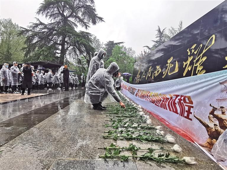 ——4月3日,陜西省“清明祭英烈”活動(dòng)在西安烈士陵園舉行,西安石油大學(xué)30余名師生代表參加了活動(dòng)。天空飄落著雨滴,“明理增信,崇德力行;興國(guó)昌邦,弦歌續(xù)唱”的祭辭在烈士陵園中回蕩。在莊嚴(yán)肅穆的氛圍中,參加活動(dòng)的人們面向烈士紀(jì)念墻默哀、行鞠躬禮,并為革命烈士敬獻(xiàn)鮮花。