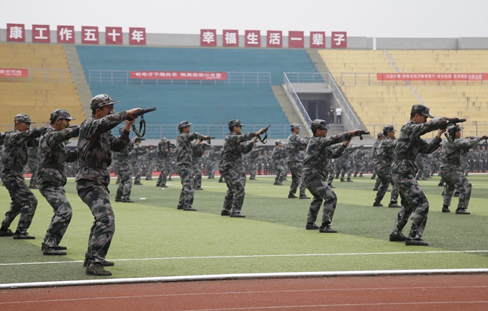 伴隨著激昂的進行曲和嘹亮的口號,2020級本科生分12個方陣,邁著整齊矯健的步伐,精神飽滿地經(jīng)過主席臺,向全校師生展示隊列訓(xùn)練成果。隊列成果展示后,2020級本科新生分別進行了捕俘刀、軍體拳、刺殺操、手語操等科目的表演。