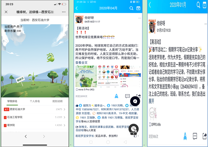 寒假至今,校易班發(fā)展中心累計開展線上活動9次,圍繞防疫教育和中國加油等主題,扎實開展正能量特色活動。通過開發(fā)易班輕應用,獨創(chuàng)“植樹節(jié)為學校云植樹”的愛校榮?;顒?,日參與量近千人,截至目前參與總?cè)藬?shù)過萬人。通過此類活動,進一步增強了學生的集體榮譽感,提升了學生參與網(wǎng)絡思政活動的主動性,也為我校今后持續(xù)開展網(wǎng)絡思政育人工作積累了寶貴經(jīng)驗。