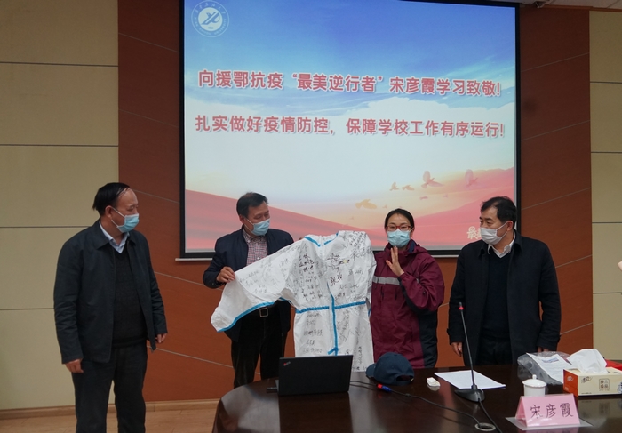 發(fā)言結(jié)束后,宋彥霞還將一件經(jīng)過(guò)多次消毒的,上面簽滿了醫(yī)療隊(duì)員、警察、志愿者、社區(qū)工作者簽名的防護(hù)服送給了學(xué)校。