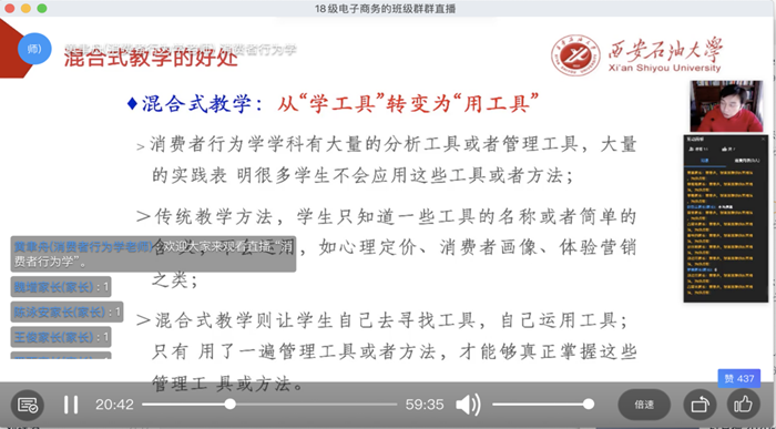 經(jīng)濟(jì)學(xué)系和管理科學(xué)與工程系。為了保障教學(xué)效果,經(jīng)濟(jì)學(xué)系和管科系的老師們也積極踐行“線上”+“線下”的混合式教學(xué)方式,將在線教學(xué)和傳統(tǒng)教學(xué)的優(yōu)勢結(jié)合起來,把學(xué)習(xí)者的學(xué)習(xí)由淺到深地引向深度學(xué)習(xí)。老師們提前制定預(yù)案,從課程準(zhǔn)備、課程資源、課堂教學(xué)、師生互動、指導(dǎo)答疑和作業(yè)考評等方面進(jìn)行教學(xué)設(shè)計和思考。課程多采用多平臺相結(jié)合方式進(jìn)行開展,如中國mooc課程+釘釘直播教學(xué)+釘釘/微信。選用中國mooc平臺的“國家精品課”開展基礎(chǔ)知識學(xué)習(xí);通過釘釘直播,開展與章節(jié)內(nèi)容相關(guān)的消費者行為學(xué)問題討論;通過釘釘班級群/微信群,發(fā)布學(xué)習(xí)重難點、作業(yè),保障溝通的及時性。這種多平臺相結(jié)合的形式,既拓展了學(xué)生自主學(xué)習(xí)能力、鍛煉了學(xué)生學(xué)以致用的思辨能力,更重要的是培養(yǎng)學(xué)生們做“建設(shè)者”的意識,學(xué)生反饋效果良好。
