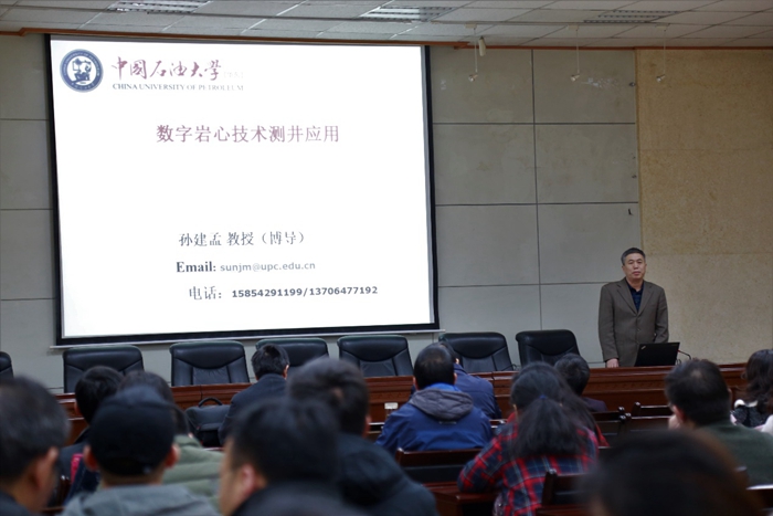 聘任儀式結(jié)束后,中國石油大學(xué)(華東)孫建孟教授以“數(shù)字巖心技術(shù)在測井中的應(yīng)用”為題,在第三會議室為我校師生作了學(xué)術(shù)報告。孫建孟教授從數(shù)字巖心建模、巖石物理屬性模擬等方面對數(shù)字巖心技術(shù)進(jìn)行了介紹,指出數(shù)字巖心技術(shù)與常規(guī)巖石物理實驗相比存在的優(yōu)勢,是研究微觀因素對巖石物理屬性影響的重要手段,同時展望了數(shù)字巖心技術(shù)在地質(zhì)、地震、巖土工程等學(xué)科中的應(yīng)用前景。
