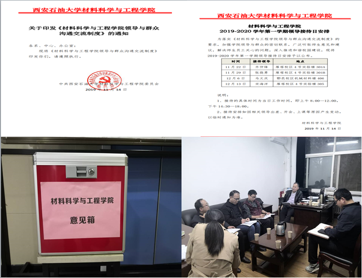 構(gòu)建溝通交流機(jī)制。出臺(tái)《材料科學(xué)與工程學(xué)院領(lǐng)導(dǎo)與群眾溝通制度》,對(duì)學(xué)院領(lǐng)導(dǎo)深入一線提出了明確要求,設(shè)立院領(lǐng)導(dǎo)每周定期接待日,在兩個(gè)校區(qū)放置了學(xué)院意見(jiàn)箱。