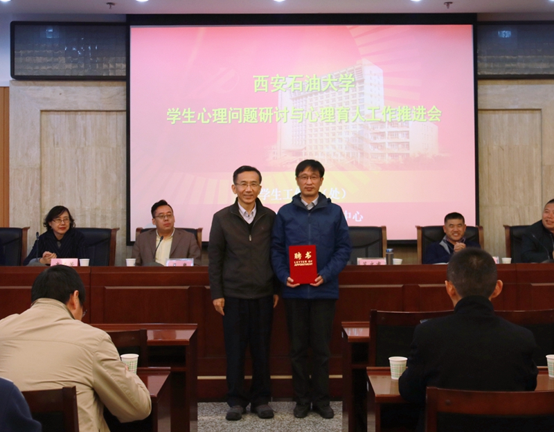 張木副書記首先為特聘高級(jí)顧問、心理咨詢師蘇文甫副校長發(fā)放聘書,這是繼2019年上半年,我校特聘交大一附院王崴大夫和西京醫(yī)院郭力大夫?yàn)樾睦碜稍冾檰柡笤僖淮纹溉胃呒?jí)顧問。蘇文甫副校長談了“三個(gè)感到”,第一個(gè)感到是生活的動(dòng)力離不開儀式感的不斷激活,第二個(gè)感到是生存的能力離不開興趣值的不斷提升,第三個(gè)感到是生命的潛力離不開環(huán)境度的不斷更新,他表示在今后的工作中將為學(xué)生的健康成長、為學(xué)校的安全穩(wěn)定貢獻(xiàn)自己的力量。