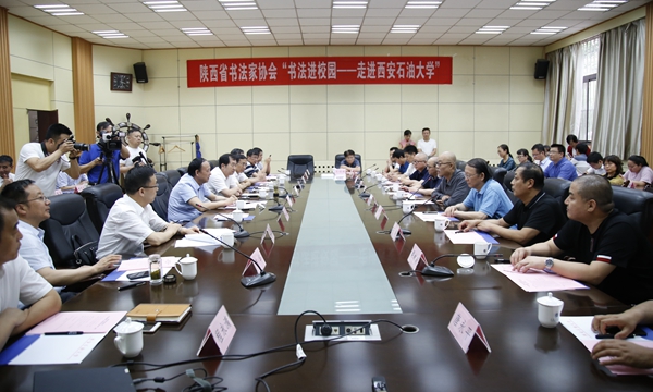 6月28日下午,陜西省書法家協(xié)會“書法進校園——走進西安石油大學(xué)”活動在雁塔校區(qū)會議中心第一會議室舉辦。中國書法家協(xié)會理事、陜西省書法家協(xié)會主席陳建貢一行13人來我校與師生進行了交流座談。我校校領(lǐng)導(dǎo),相關(guān)部門和學(xué)院負責(zé)人,校書法協(xié)會教師代表、學(xué)生代表以及多家媒體記者參加了活動。
