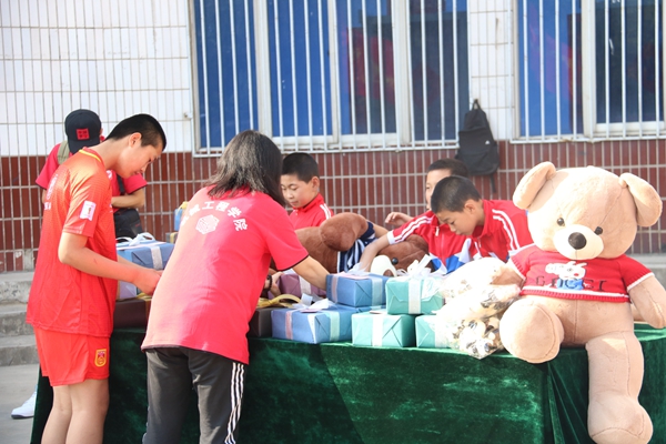 大愛無言,真愛無疆。小朋友們對師生們的到來舉行了熱烈的歡迎儀式,東周兒童村村民委員會主任楊彪也對大家的到來表示了最熱烈的歡迎和衷心的感謝,并充分肯定了本次活動的意義。他表示,這二十多年來,孩子們在和大哥哥大姐姐們相處之后,都逐漸走出了生活的陰影,大都長高了,長胖了,臉上也露出了童年的天真和歡笑。同時,機械工程學院黨委書記田黨宏也對小朋友們進行了勉勵和鼓舞,并表示機械工程學院的全體師生會一直將愛心持續(xù)下去。學生工作部部長趙健和人文學院黨委書記余小勇代表此行的志愿者把屬于孩子們的心愿禮物親自送到他們的手中。由音樂系和少數(shù)民族的同學們?yōu)榇蠹規(guī)砹斯艠泛献唷毒艃骸贰洞航ㄔ乱埂贰犊鞓返柠溛鱽砥铡贰锻米游琛返染始姵实墓?jié)目,全體師生與孩子們一起互動,共同聯(lián)歡,一同沉浸在這愛的海洋里。