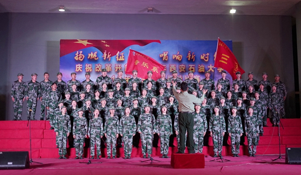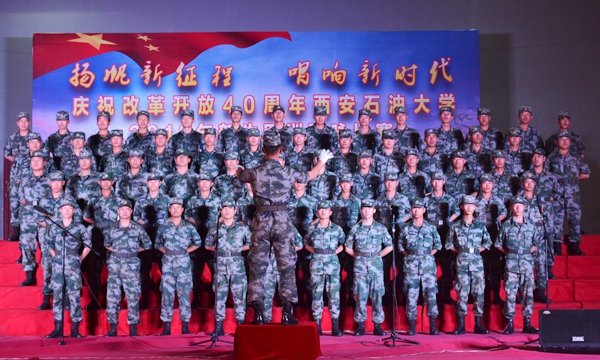 9月17日晚,我?!皳P(yáng)帆新征程,唱響新時(shí)代——慶祝改革開放40周年西安石油大學(xué)2018級(jí)新生軍訓(xùn)歌詠比賽”在鄠邑校區(qū)西田徑場(chǎng)舉行。軍訓(xùn)領(lǐng)導(dǎo)小組組長(zhǎng)、校黨委副書記張木,軍訓(xùn)旅司令部參謀長(zhǎng)劉廣出席活動(dòng)。學(xué)生工作處、保衛(wèi)處、校團(tuán)委、教務(wù)處、鄠邑校區(qū)管理辦公室等相關(guān)部門負(fù)責(zé)人擔(dān)任評(píng)委,各院(系)軍訓(xùn)工作負(fù)責(zé)人及2018級(jí)全體新生一同觀看了比賽。