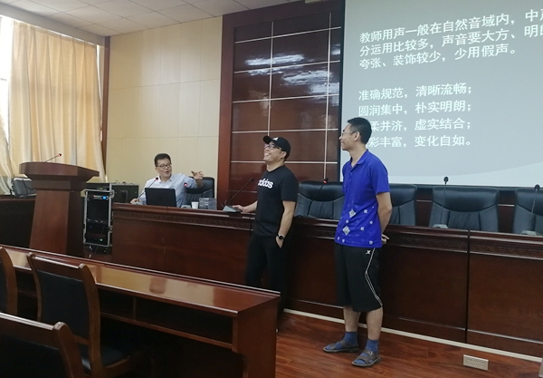 吟誦藝術(shù)國家級骨干教師、陜西師范大學(xué)何明家老師作了題為《教師教學(xué)發(fā)音技巧和嗓音保健》的講座。他從人體發(fā)聲器官解剖圖入手,深入淺出地剖析了發(fā)聲原理和影響人聲音質(zhì)的要素。他談到,教師的職業(yè)要求決定了正確發(fā)聲的必要性,一定要重視嗓音保健。他現(xiàn)場為發(fā)言的老師評估音質(zhì),分析發(fā)音存在的問題,結(jié)合現(xiàn)場案例,幫助青年教師正確理解發(fā)聲機理和運用嗓音的技巧,并耐心傳授穩(wěn)定、協(xié)調(diào)、平衡發(fā)聲的技巧。