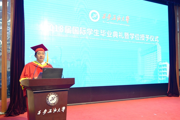 6月27日下午,我校2018屆國際學(xué)生畢業(yè)典禮暨學(xué)位授予儀式在雁塔校區(qū)學(xué)術(shù)報告廳舉行。校長李天太,特邀嘉賓、原校長屈展出席。副校長陳軍斌主持。哈薩克斯坦國際一體化基金會西安代表處負責(zé)人,我校相關(guān)部門、學(xué)院負責(zé)人,國際學(xué)生導(dǎo)師代表、國際學(xué)生教學(xué)與管理人員,全體畢業(yè)國際學(xué)生、家長代表、在校學(xué)歷留學(xué)生參加了儀式。