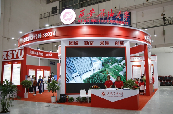 我校展區(qū)位于曲江國際會展中心核心展區(qū)A館,共有37項科研成果、15項研究生創(chuàng)新成果參展。展臺設(shè)計采用彩色圖文展板、科研成果實物展品、LED顯示、宣傳彩頁等多種形式,全方位展示了我校文化建設(shè)成果、教育扶貧成果、“互聯(lián)網(wǎng)+”大學(xué)生創(chuàng)新創(chuàng)業(yè)成果、科技成果及研究生創(chuàng)新成果,并著重突出了石油石化特色。為做好參展工作,由教務(wù)處牽頭,科技處、研究生院及相關(guān)職能處室通力合作、積極準備,按時提交資料,確保各項成果順利展出。各院(系)教師代表、招生辦公室工作人員、學(xué)生志愿者經(jīng)過認真地培訓(xùn)學(xué)習(xí),在展會上為廣大家長、學(xué)生提供了完善細致的信息咨詢服務(wù)。